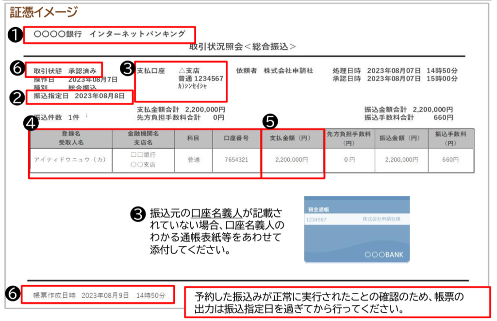 下記情報が記載された「実行結果」などの振込完了がわかる書類が必要です。