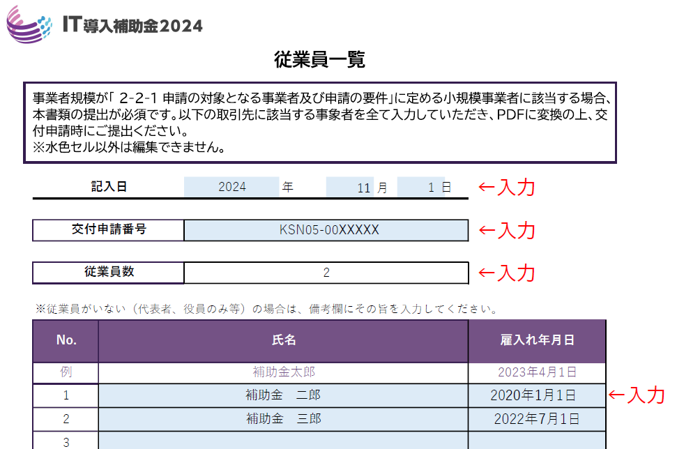②ダウンロードした「従業員一覧」に下記の通り入力