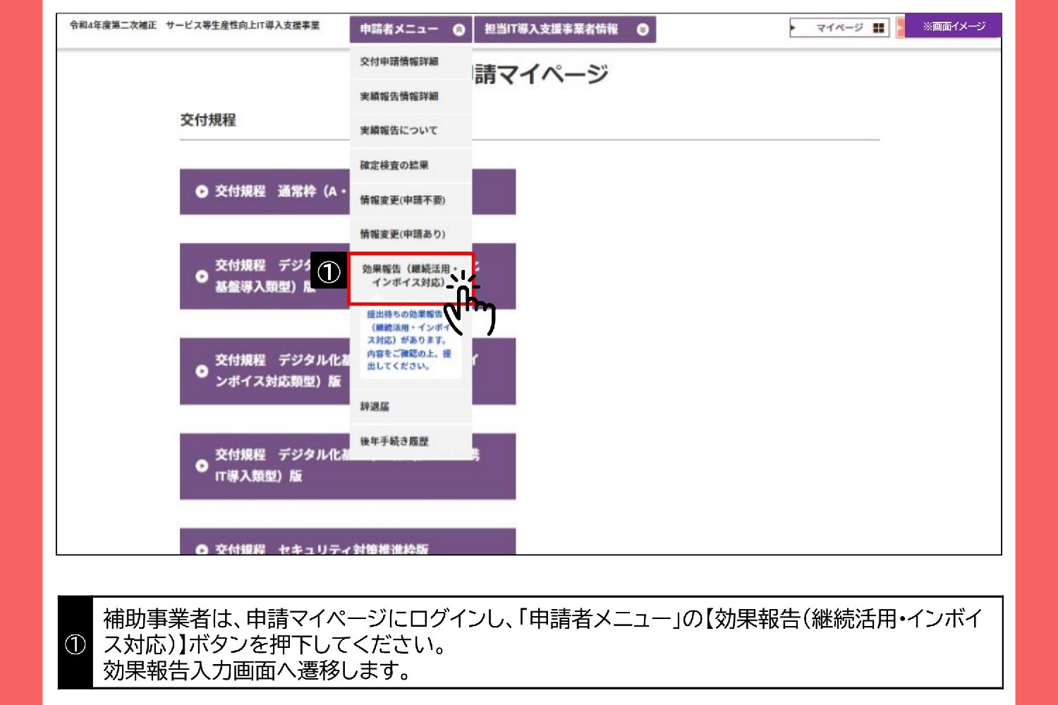 ログイン後「申請者メニュー」の「効果報告(継続活用・インボイス対応)」を押下して下さい。