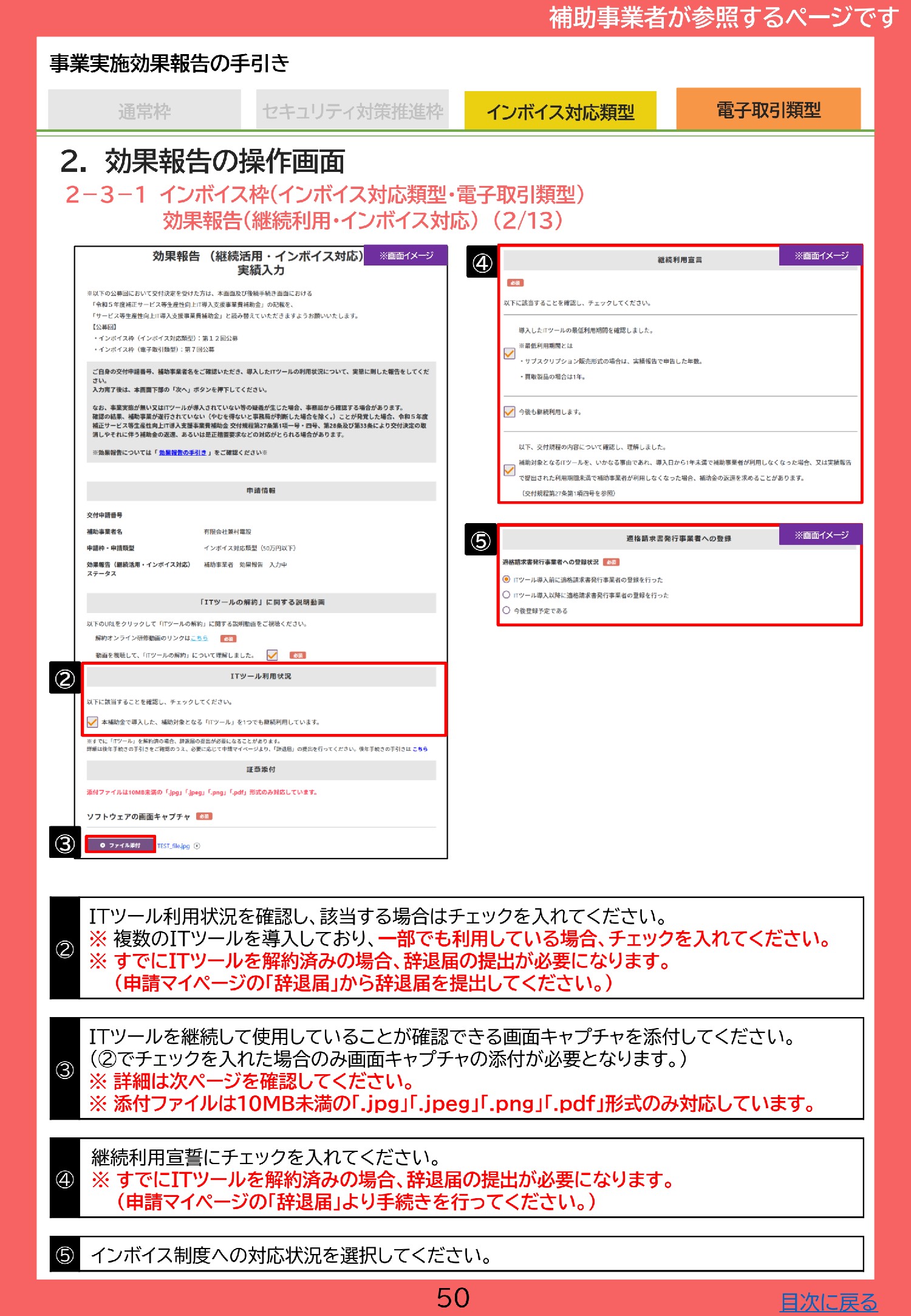 IT導入補助金2024(インボイス枠/インボイス対応類型)の効果報告全体については、下記事業実施効果報告の手引きP49以降をご参照下さい。