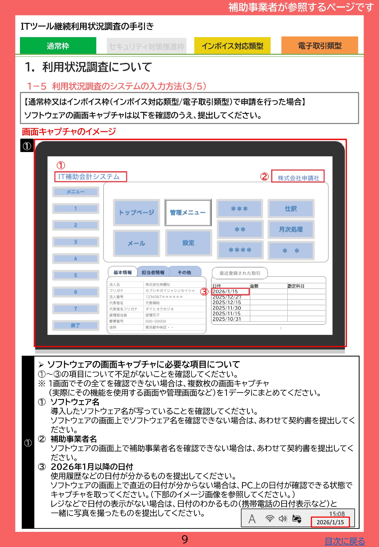 ※ソフトウェアの画面上で補助事業者(貴社)名を確認できない場合は、併せて契約書などの書類を提出