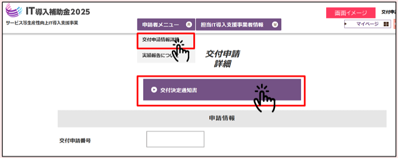 1.「申請者メニュー」の中の「交付申請情報詳細」をクリック
