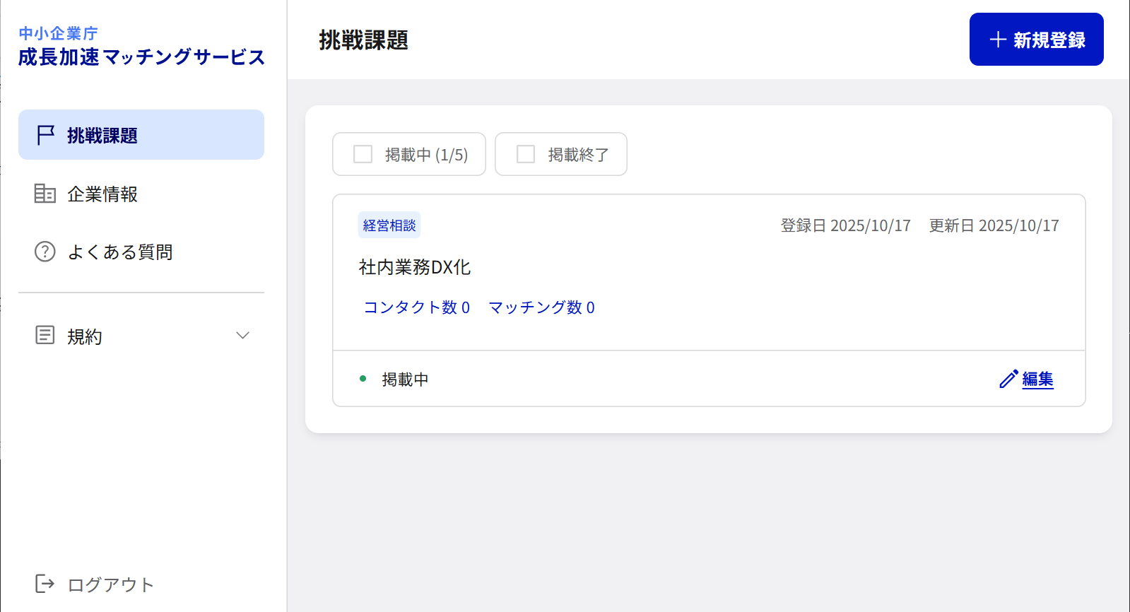 交付申請締切日時点において、中小企業庁「成長加速マッチングサービス」で会員登録を行い、挑戦課題を登録していること。