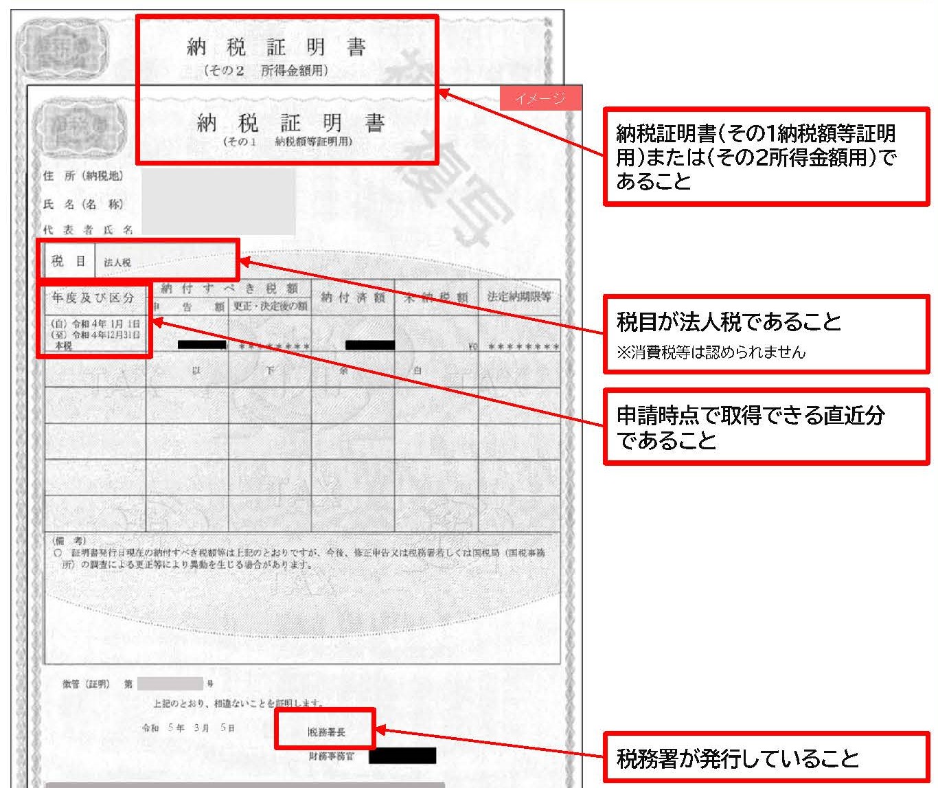 ※注:「税務署発行」の「直近決算分」の「法人税」の「納税証明書」の