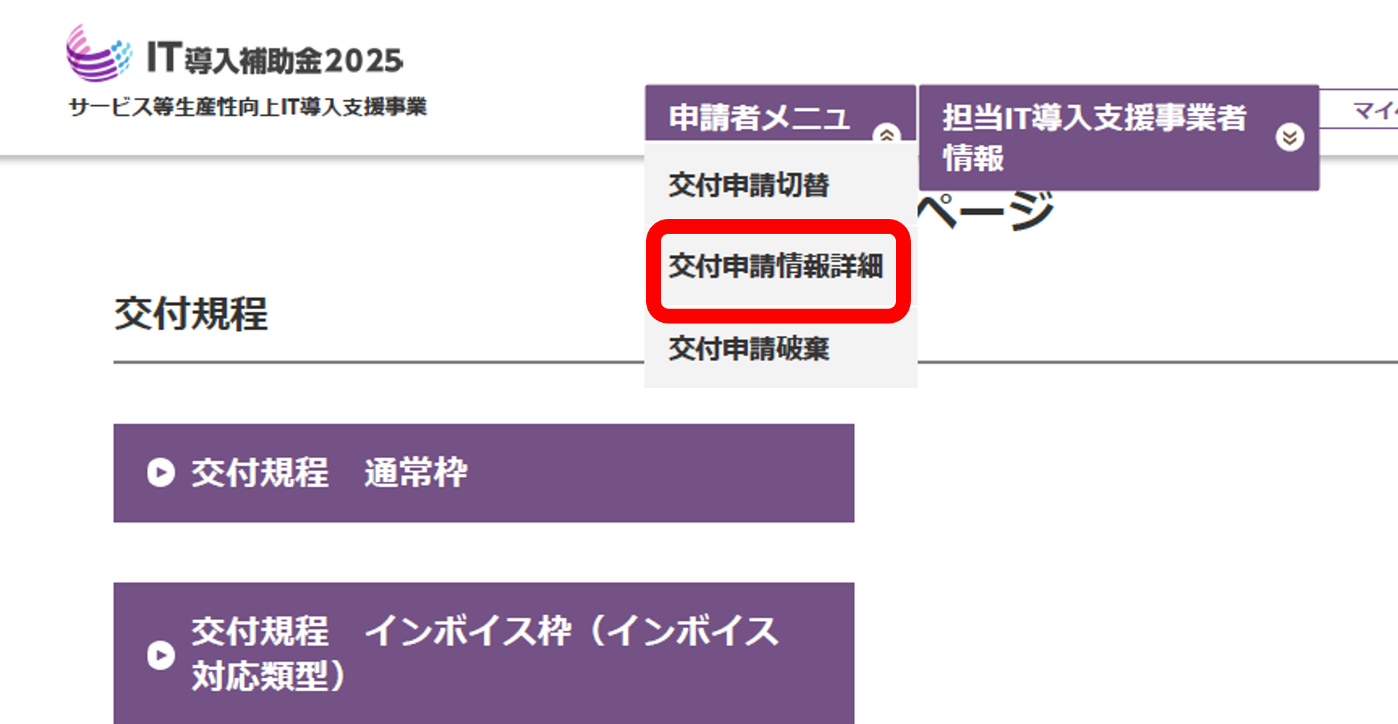 ①申請マイページ画面の上に表示されている「申請者メニュー」をクリック